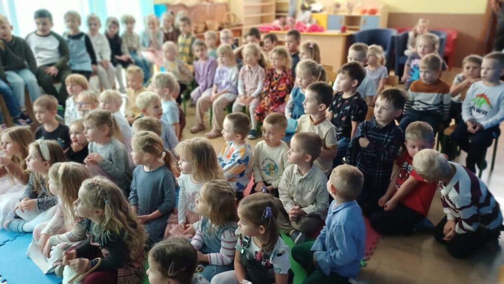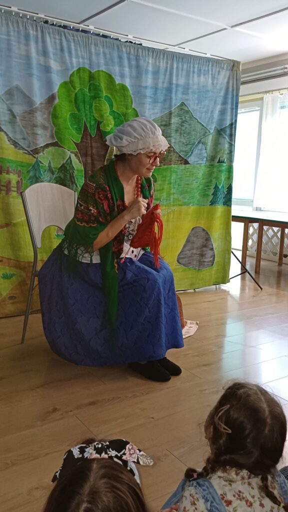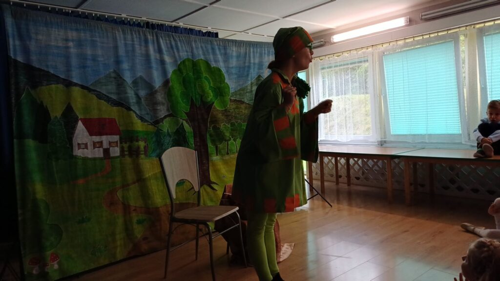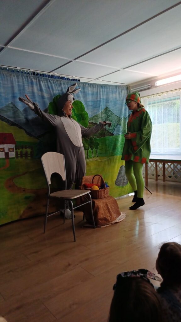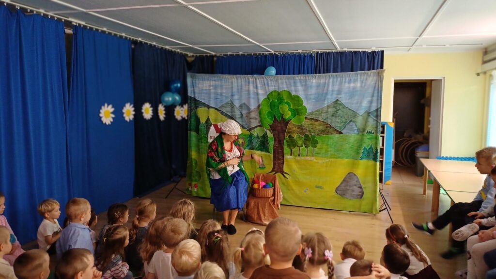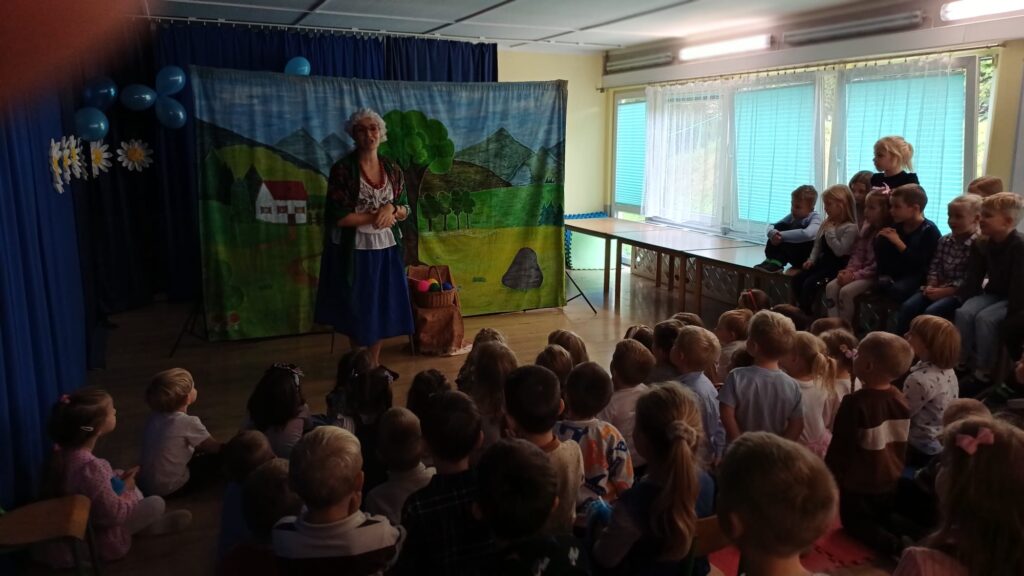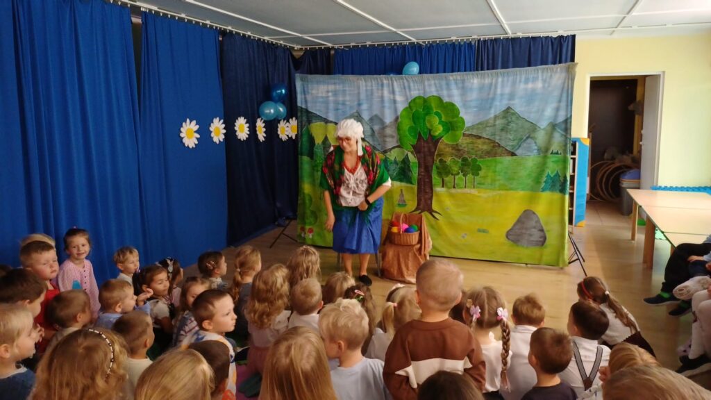 Dziś w naszym przedszkolu zagościł teatrzyk. Przedszkolaki przywitały aktorów głośnymi brawami. Z uwagą i uśmiechem obserwowały krasnala martwiącego się nadchodzącą zimą oraz babcię Danusię, którą zrobiła mu na drutach sweterek. Bajka była pełna humoru, dużo uśmiechu wywołała postać kota psotnika, zajączka i myszy. Dzieci aktywnie uczestniczyły w prezentowanej sztuce dziękując aktorom mocnymi brawami na zakończenie teatrzyku.