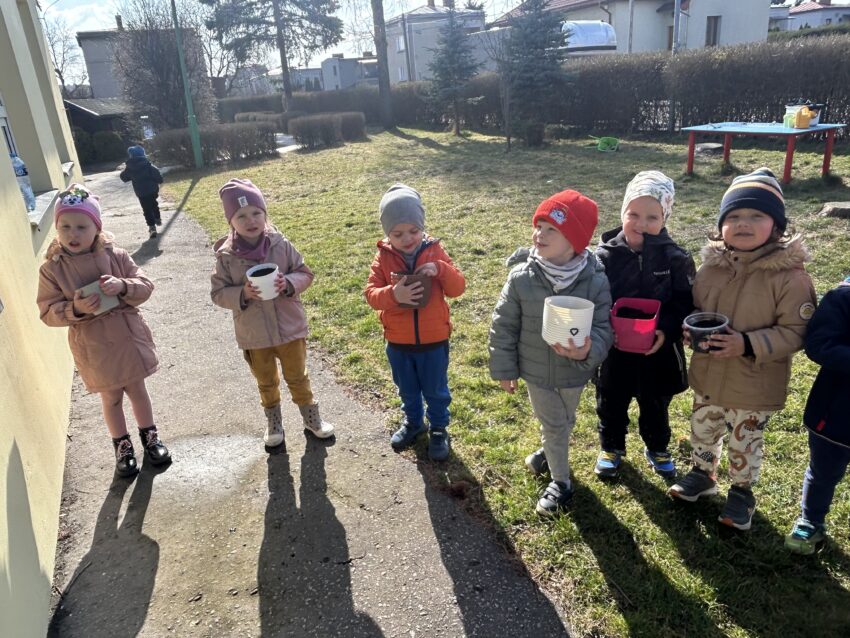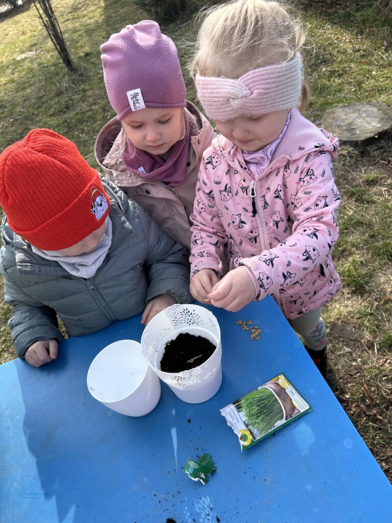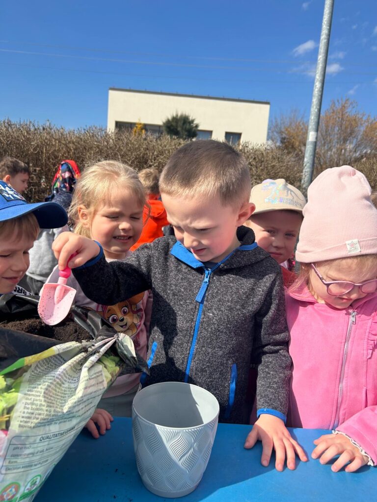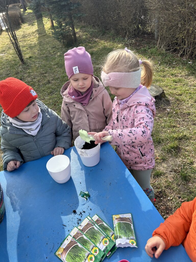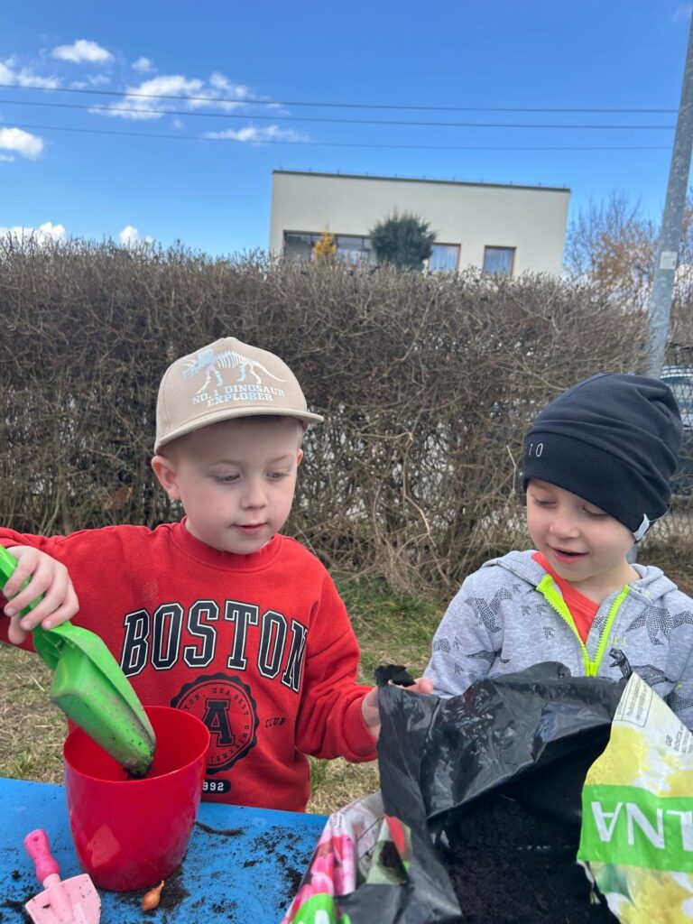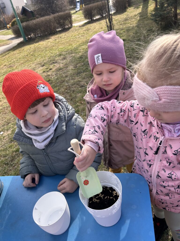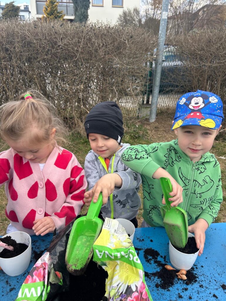 Marzec to świetna okazja do zapoznania najmłodszych z tajnikami sadzenia roślin. W oczekiwaniu na nadejście wiosny nasze przedszkolaki zamieniły się w małych ogrodników w przedszkolnym ogrodzie. Dowiedziały się jak prawidłowo sadzić cebulki oraz nasiona, czego rośliny potrzebują do wzrostu oraz jak o nie dbać. Przez najbliższe dni będziemy wspólnie obserwować jak kiełkują zasadzone rośliny ucząc się przy tym odpowiedzialności oraz cierpliwości.
