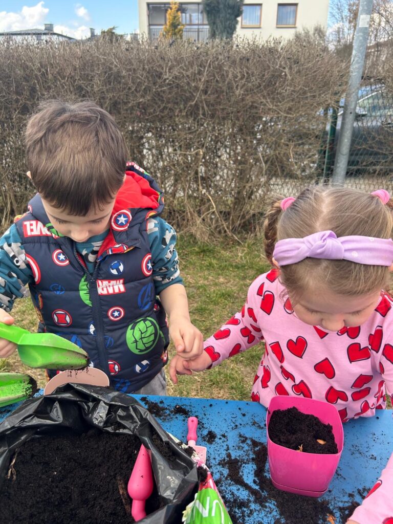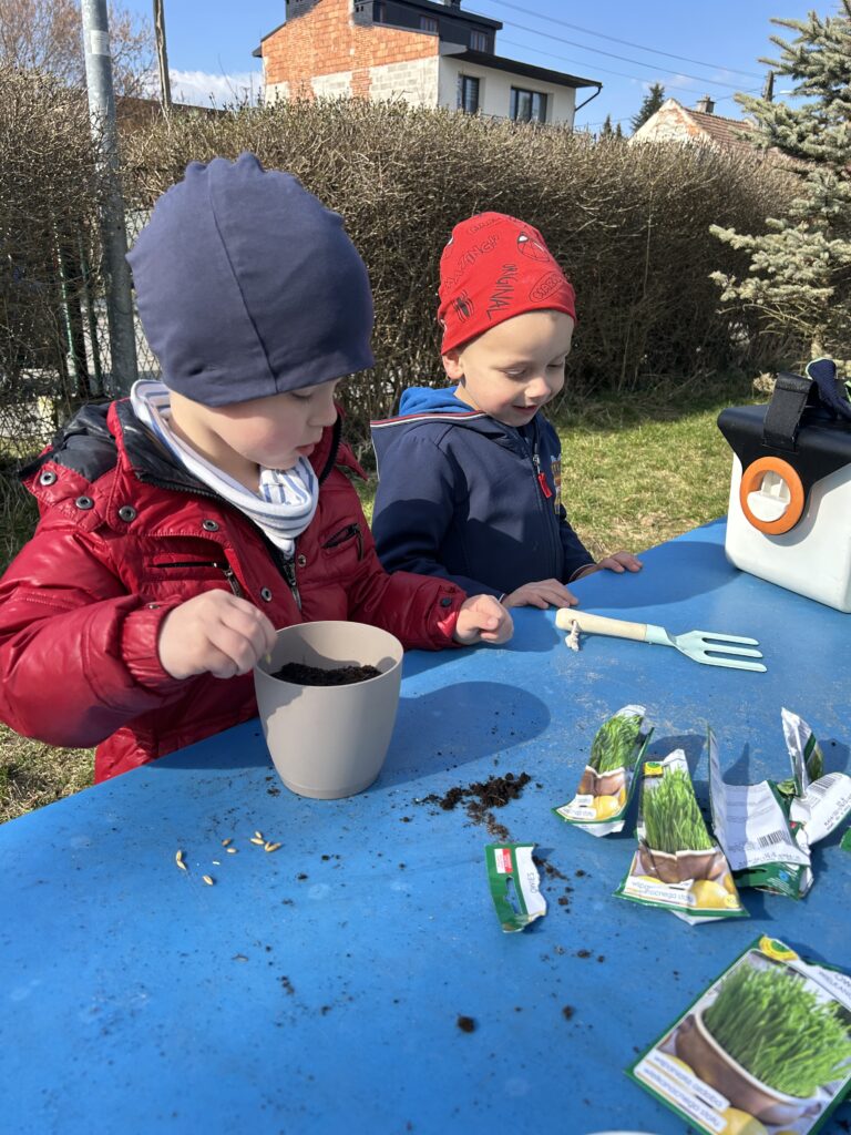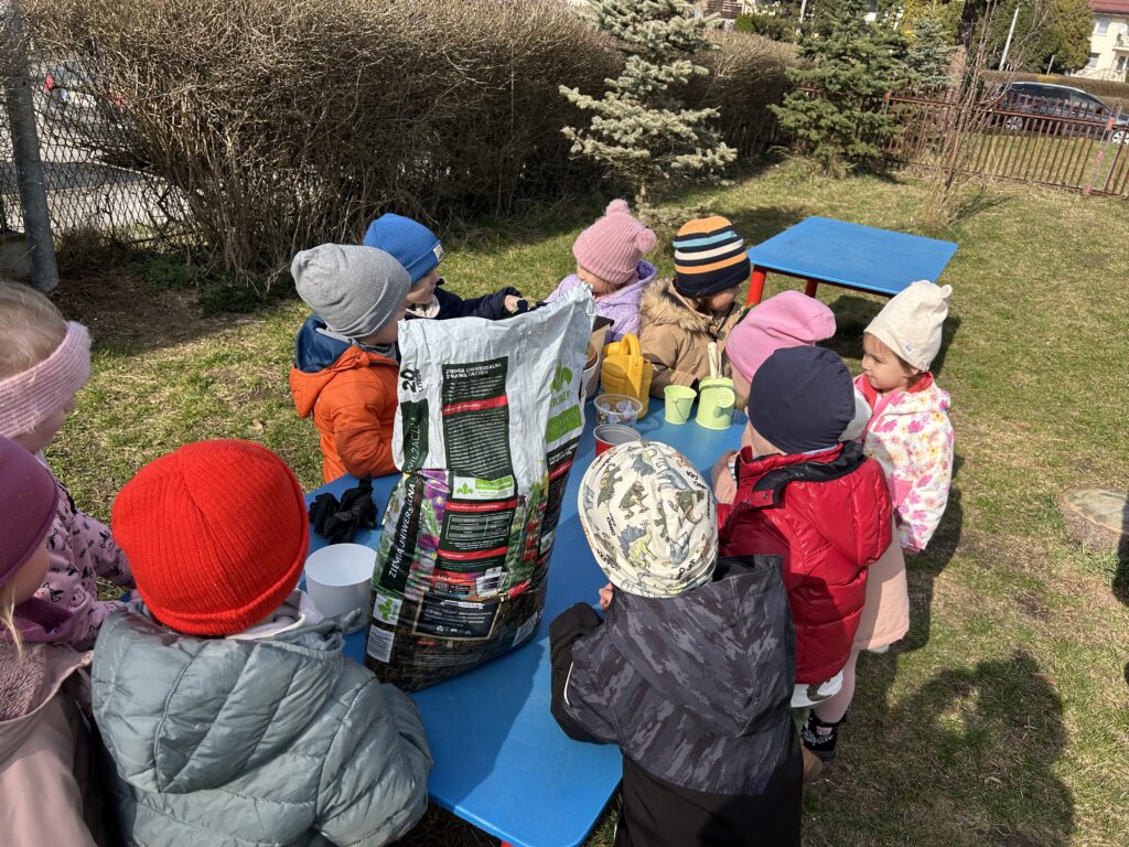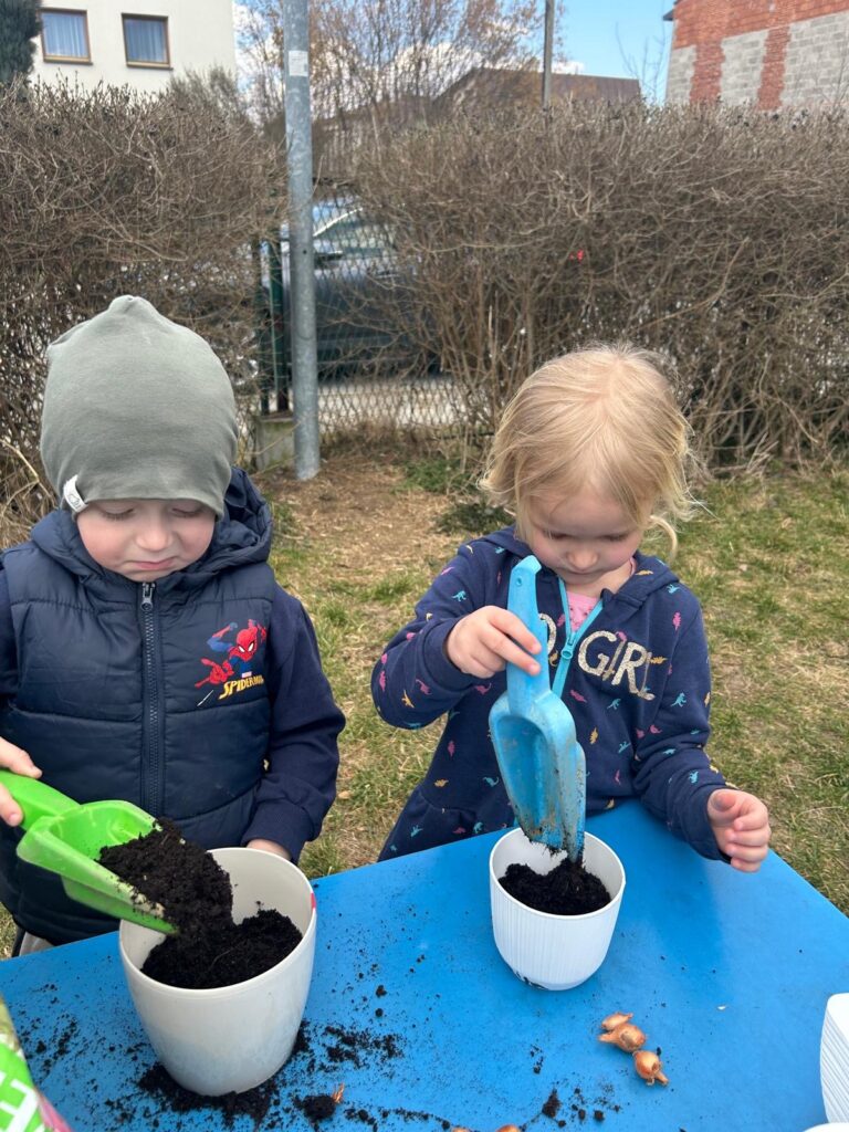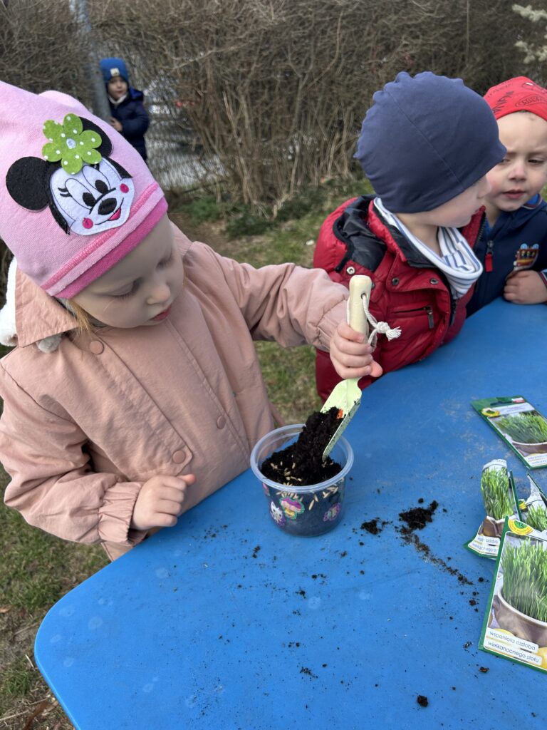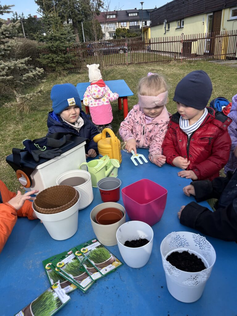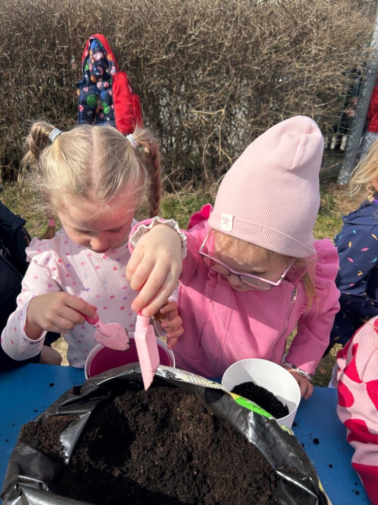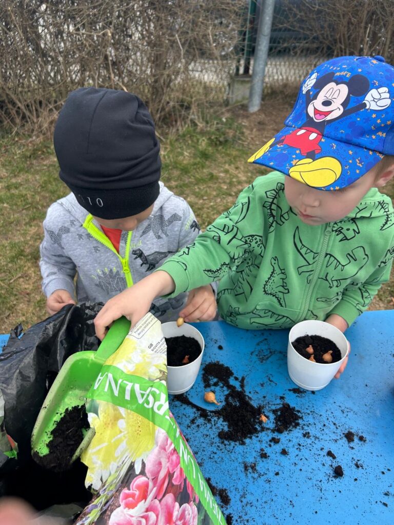 Marzec to świetna okazja do zapoznania najmłodszych z tajnikami sadzenia roślin. W oczekiwaniu na nadejście wiosny nasze przedszkolaki zamieniły się w małych ogrodników w przedszkolnym ogrodzie. Dowiedziały się jak prawidłowo sadzić cebulki oraz nasiona, czego rośliny potrzebują do wzrostu oraz jak o nie dbać. Przez najbliższe dni będziemy wspólnie obserwować jak kiełkują zasadzone rośliny ucząc się przy tym odpowiedzialności oraz cierpliwości.