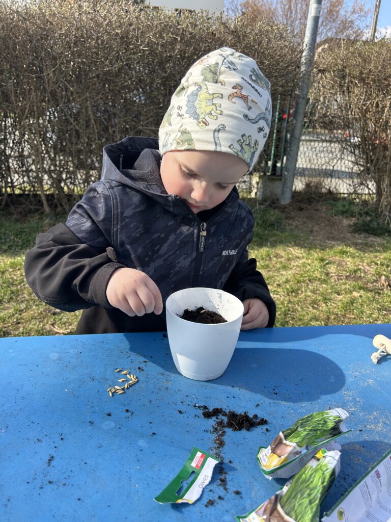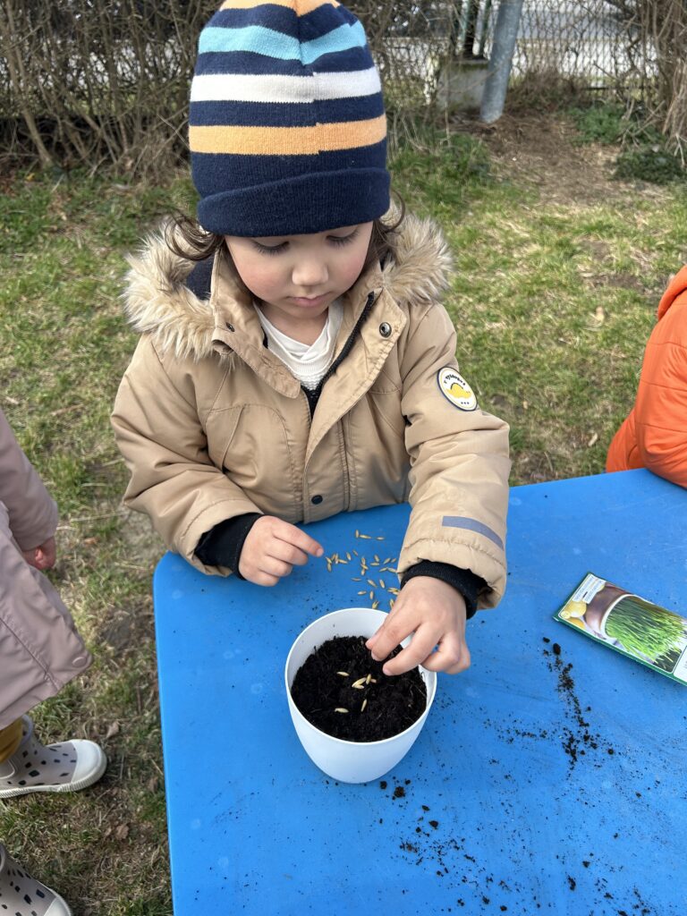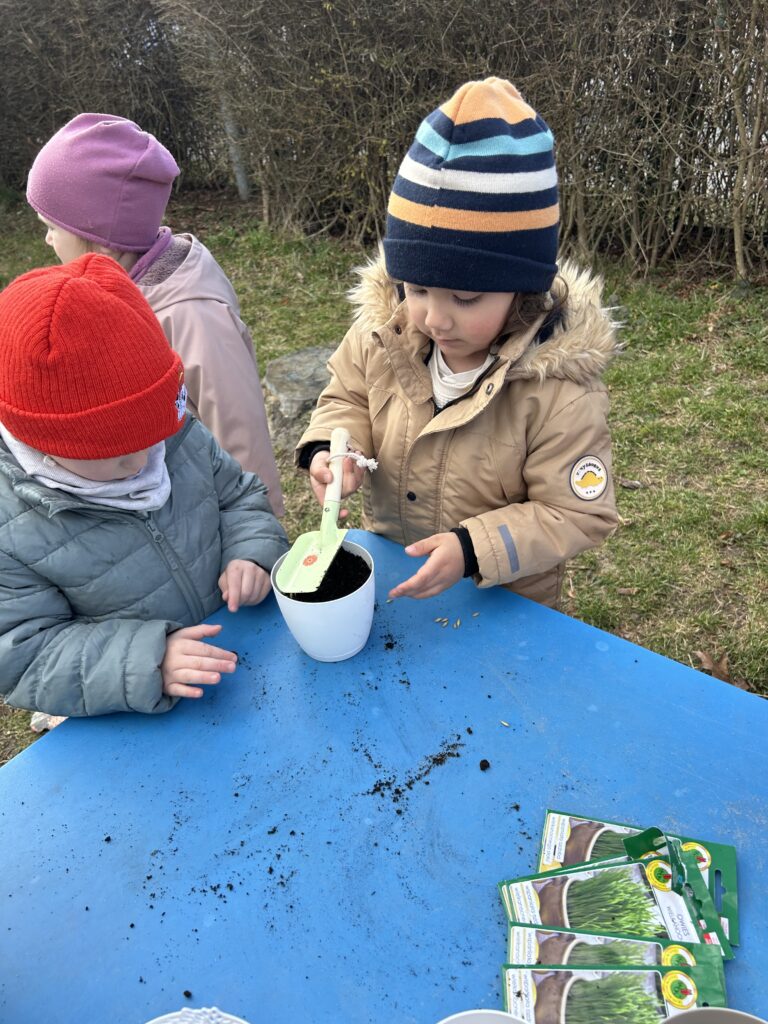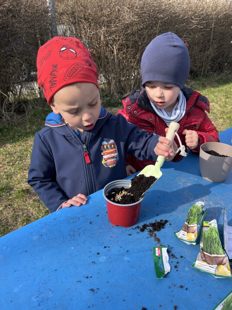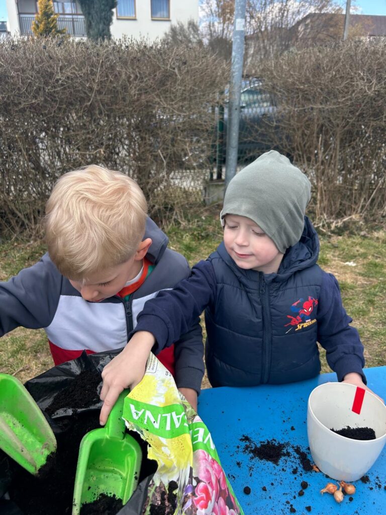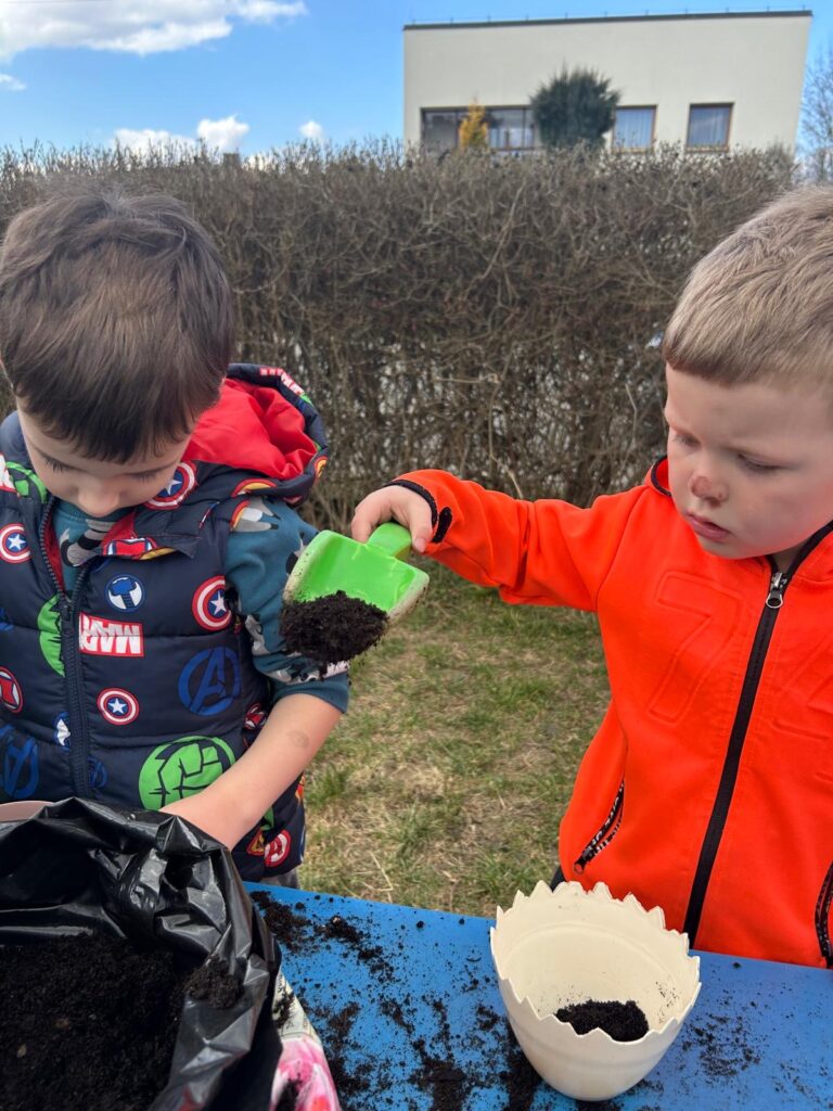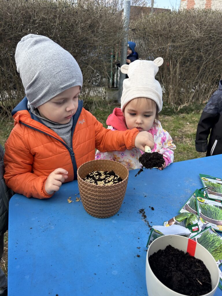 Marzec to świetna okazja do zapoznania najmłodszych z tajnikami sadzenia roślin. W oczekiwaniu na nadejście wiosny nasze przedszkolaki zamieniły się w małych ogrodników w przedszkolnym ogrodzie. Dowiedziały się jak prawidłowo sadzić cebulki oraz nasiona, czego rośliny potrzebują do wzrostu oraz jak o nie dbać. Przez najbliższe dni będziemy wspólnie obserwować jak kiełkują zasadzone rośliny ucząc się przy tym odpowiedzialności oraz cierpliwości.